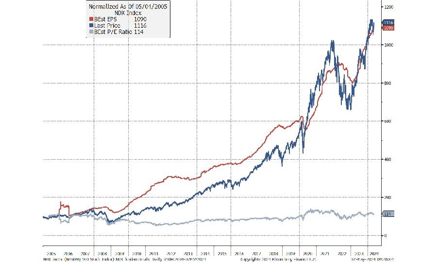 L'avanzata dei titoli tecnologici non sembra conoscere soste a Wall Street. Una delle aziende simbolo di questo momento è il produttore americano di processori Nvidia, che è riuscito a superare la soglia dei 3mila miliardi di dollari di capitalizzazione come solo Apple e Microsoft, non a caso altri due titoli tecnologici, erano riusciti a fare prima di lei. Questo andamento del mercato ha stimolato il dibattito tra investitori e analisti: siamo in presenza di una nuova bolla tecnologica? La risposta è che, al momento, non se ne riscontrano i segnali. Pur in presenza di valutazioni azionarie elevate, infatti, queste in passato hanno raggiunto livelli ancora più alti. Inoltre, si può osservare oggi come la crescita delle quotazioni dei titoli tecnologici sia generalmente assistita da un corrispondente, se non ancor più sostenuto, aumento degli utili.