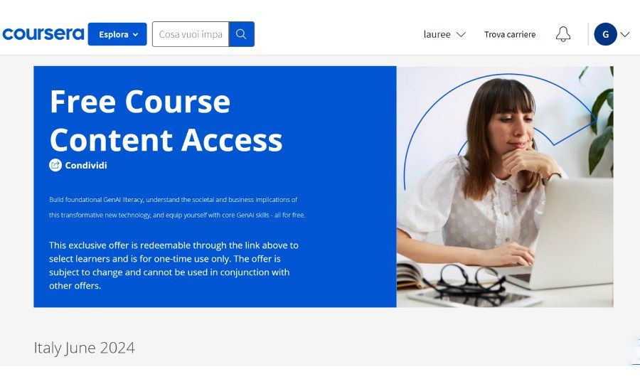 All'inizio Coursera utilizzava solamente dei corsi universitari e i nostri fondatori dell'Università di Stanford hanno trovato sin da subito dei partner fra i migliori di più alto livello. Ovviamente in Italia non potevano mancare la Bocconi, La Sapienza e il Politecnico, che hanno milioni di studenti iscritti. Adesso abbiamo in Italia 1,2 milioni di studenti. Per quanto riguarda l'età mediana, è leggermente superiore rispetto a quella generale: sono 36 anni, con una leggera prevalenza degli iscritti maschi rispetto alle donne. Adesso però i corsi possono essere in italiano con la possibilità appunto della traduzione. Per quanto riguarda i corsi principali, c'erano per esempio corsi ovviamente sulla AI generativa e su vari tipi di corsi professionalizzanti di business, quindi quelli che servono di solito per migliorare a livello di carriera. Il problema, come dicevo, è che se non si parla inglese prima era praticamente impossibile accedere ai nostri corsi, tanto per un individuo singolo come per una piccola impresa. Con la traduzione di 4700 corsi in italiano, ora tanto imprese come singoli studenti che non parlano inglese saranno in grado di seguire i nostri corsi.