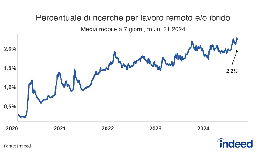 In Italia, a fine luglio 2024, si è raggiunto il massimo storico di ricerche di occupazioni che consentano modalità di lavoro ibrido, pari al 2,2% sul totale delle ricerche effettuate. Ciò rappresenta un aumento dell'1,95% da gennaio 2020 e dello 0,25% rispetto all'inizio del 2024, indicando che la percentuale di lavoratori interessati alle possibilità offerte dal lavoro ibrido è in costante espansione.