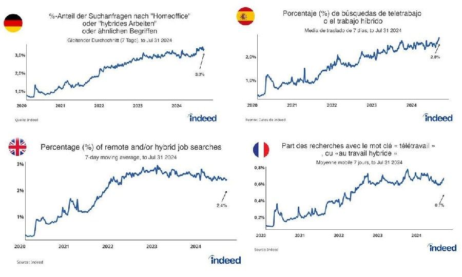 L'andamento è simile anche nel resto d'Europa. In particolare, la curva registra un andamento crescente, con il picco delle ricerche per lavoro ibrido registrato a fine luglio 2024 in Germania (3,3%) e Spagna (2,8%). Seppur il trend si sia stabilizzato nel Regno Unito e in Francia, si evidenzia ancora un radicato interesse per il lavoro ibrido anche da parte dei lavoratori di questi Paesi.