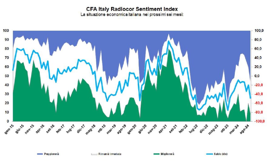 Le aspettative degli investitori professionali italiani certificati CFA sull'economia italiana continuano a peggiorare. Il "Sentiment Index", che misura il loro ottimismo o pessimismo, è sceso a -48 punti, in calo rispetto all'ultima rilevazione. Il sondaggio è stato svolto da CFA Society Italy, in collaborazione con Il Sole 24 Ore Radiocor, tra i suoi soci nel periodo 19 - 31 agosto 2024.