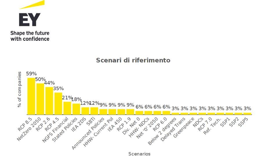 A livello globale, secondo i dati EY, emerge come il 41% delle realtà prese in esame abbia già in atto piani per gestire i rischi climatici, contribuendo al raggiungimento degli obiettivi globali di decarbonizzazione, mentre poco più di un quinto, il 21%, abbia l'intenzione di svilupparne in futuro. Un numero crescente di aziende – il 67% in totale, in aumento rispetto al 58% dell'anno scorso – sta utilizzando l'analisi degli scenari, come raccomandato dalla TCFD, per valutare la scala e i tempi dei possibili rischi climatici, continuando una tendenza al rialzo rispetto agli anni precedenti; inoltre, quasi tre quarti (71%) hanno utilizzato sia analisi qualitative che quantitative.