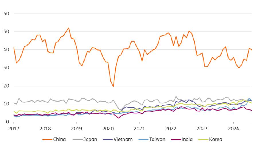 Seguiremo con attenzione anche l'elenco dei manipolatori valutari degli Stati Uniti, perché potrebbe fornire un indizio su chi sarà il prossimo bersaglio. Mentre nessun partner commerciale ha soddisfatto tutti i criteri richiesti per essere etichettato come manipolatore di valuta nel rapporto di giugno 2024, sette economie sono state inserite nell'elenco del Tesoro statunitense per il monitoraggio: Cina, Giappone, Taiwan, Malesia, Singapore, Vietnam e Germania.