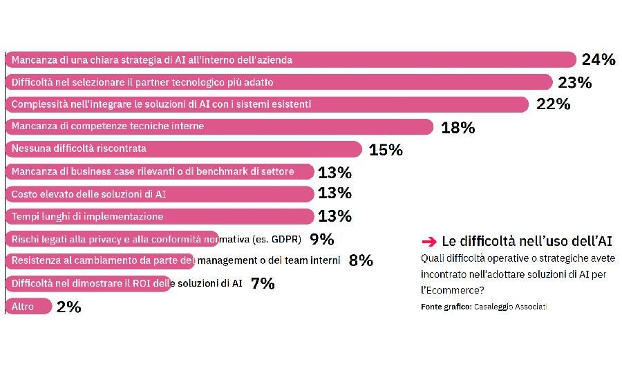 Il 35% delle aziende di Ecommerce italiane ritiene che l'AI stia già avendo un impatto significativo sul loro modello di business. Il 48% prevede una svolta entro il 2025. L'AI continua a espandere i suoi utilizzi, con il 2025 che si preannuncia come l'anno dell'AI agentica.