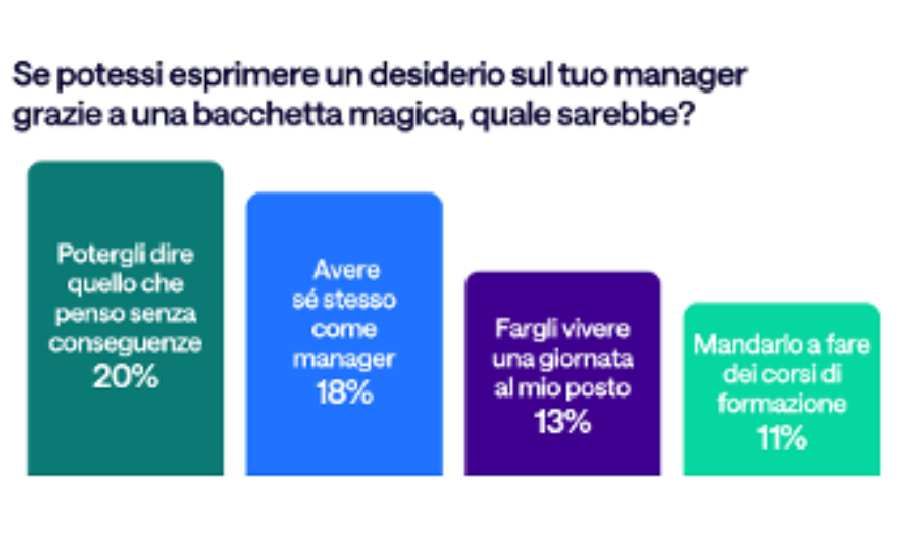 Le risposte raccolte evidenziano una chiara mancanza di empatia, pianificazione e ascolto. Tuttavia, più delle percentuali, colpiscono i desideri espliciti dei lavoratori riguardo a ciò che vorrebbero cambiare. In cima ai pensieri non ci sono ambizioni irrealistiche o benefit aziendali, ma un bisogno fondamentale: la possibilità di esprimere il proprio pensiero senza temere conseguenze (20%), il desiderio di sostituire il proprio responsabile con sé stessi (18%) o, più pragmaticamente, la volontà di vedere i manager finalmente formati nella gestione delle persone (11%).