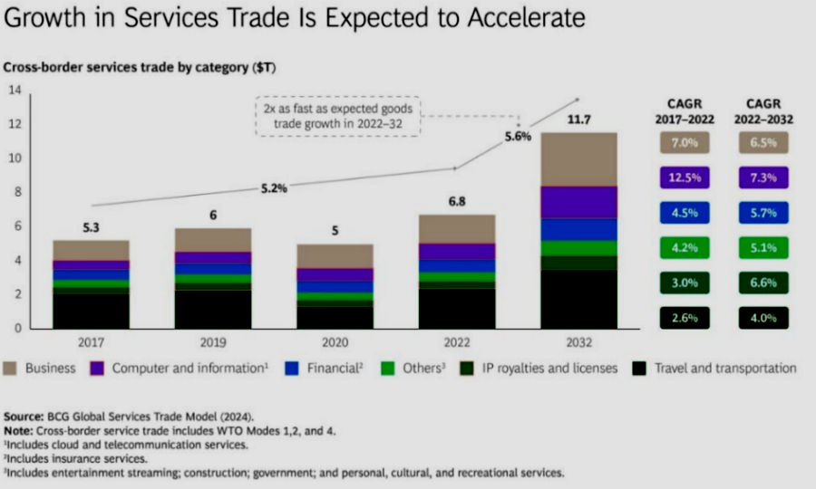 Il commercio di servizi dovrebbe superare gli 11.700 miliardi di dollari entro il 2032, con una crescita media annua del 5,6%. Questo trend è analizzato nel report di Boston Consulting Group (BCG) intitolato Services Are the New Fault Lines in Global Trade.