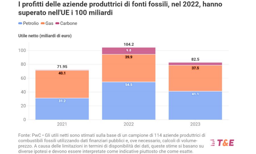 Tradizionalmente, i prezzi dei combustibili fossili tendono a salire rapidamente durante i periodi di instabilità geopolitica o shock internazionali. Questo avviene nonostante i costi di produzione rimangano relativamente stabili. Di conseguenza, le società petrolifere e del gas possono vedere i loro profitti aumentare in maniera considerevole. L'analisi, condotta da PwC per conto di T&E, ha mostrato che nel 2022 le società petrolifere e del gas dell'UE hanno realizzato oltre 104 miliardi di euro di profitti, con un incremento del 45% rispetto all'anno precedente. Sebbene nel 2023 si sia registrato un calo del 21%, i profitti hanno comunque superato gli 82 miliardi di euro.