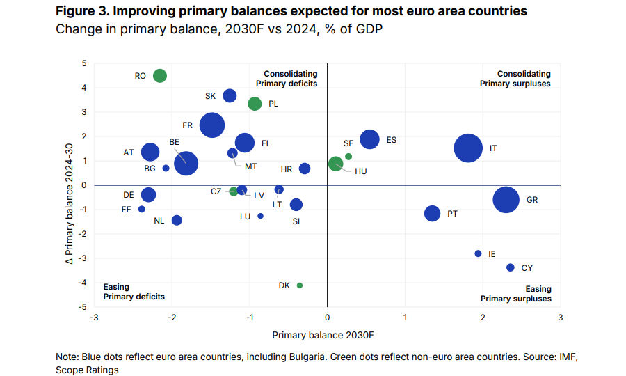 La crescita potenziale e le pressioni fiscali strutturali sottostanti, in particolare derivanti dalla spesa sociale e dall'aumento degli interessi, sono i principali fattori delle nostre proiezioni debito/PIL fino al 2030. Prevediamo una significativa convergenza tra gli Stati membri, con i Paesi con rating precedentemente più bassi che ridurranno drasticamente il debito grazie alle riforme economiche e fiscali degli ultimi anni.
