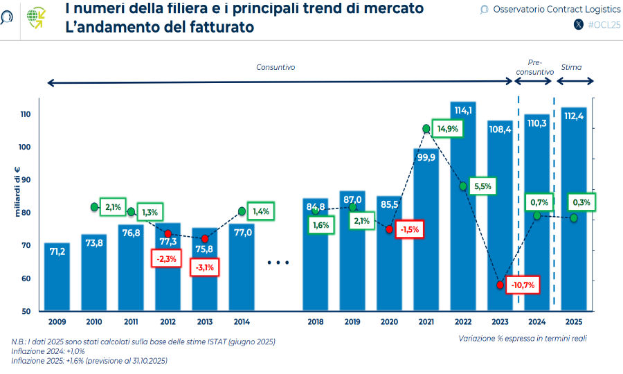 Dopo un 2023 segnato dalla contrazione, principalmente a causa delle tariffe di trasporto internazionale, il fatturato della Logistica conto terzi in Italia è tornato su un sentiero di crescita moderata. Secondo le previsioni dell'Osservatorio Contract Logistics "Gino Marchet" del Politecnico di Milano, il settore raggiungerà un valore di 112,4 miliardi di euro nel 2025. Nello specifico, la crescita nominale è stimata al +1,7% per il 2024 e al +1,9% per il 2025. Nonostante questo segnale di ripresa, il comparto (che conta circa 79.000 aziende) sta vivendo una profonda evoluzione guidata dall'Intelligenza Artificiale (AI).