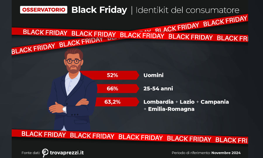 Il pubblico del Black Friday è sempre più adulto ed esperto. A novembre 2024, gli utenti di Trovaprezzi.it erano composti per il 52% da uomini e per il 48% da donne, con il 65% del totale di età compresa tra 25 e 54 anni. L'utente tipo utilizza l'evento per una gestione oculata del bilancio familiare, non come sfogo impulsivo. Le regioni più attive negli acquisti sono state la Lombardia (33,9%), il Lazio (14,6%), la Campania (7,7%) e l'Emilia-Romagna (7%).