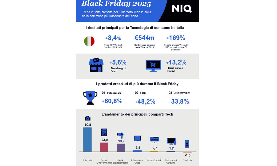 Il mercato della Tecnologia di Consumo ha guidato gran parte di questa espansione. Le rilevazioni settimanali di NielsenIQ (NIQ), relative al periodo dal 24 al 30 novembre 2025, indicano una robusta crescita del fatturato pari al +8,4% a valore. In totale, questa settimana di sconti ha generato un controvalore di 543,7 milioni di euro per questo specifico perimetro di prodotti. La settimana del Black Friday si è così confermata la più redditizia del 2025 per giro d'affari, superando del +169% il fatturato totale di una settimana media dell'ultimo anno.