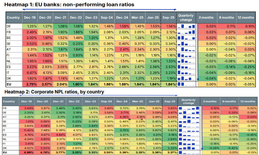 Nel terzo trimestre?2025, l'ultimo dato disponibile dell'EBA, il rapporto NPL consolidato nell'UE si attestava all'1,84%, con variazioni trimestrali nazionali di 3-4 punti base. Germania, Francia e Belgio hanno registrato i maggiori incrementi, mentre Danimarca, Italia e Spagna hanno continuato il trend discendente.