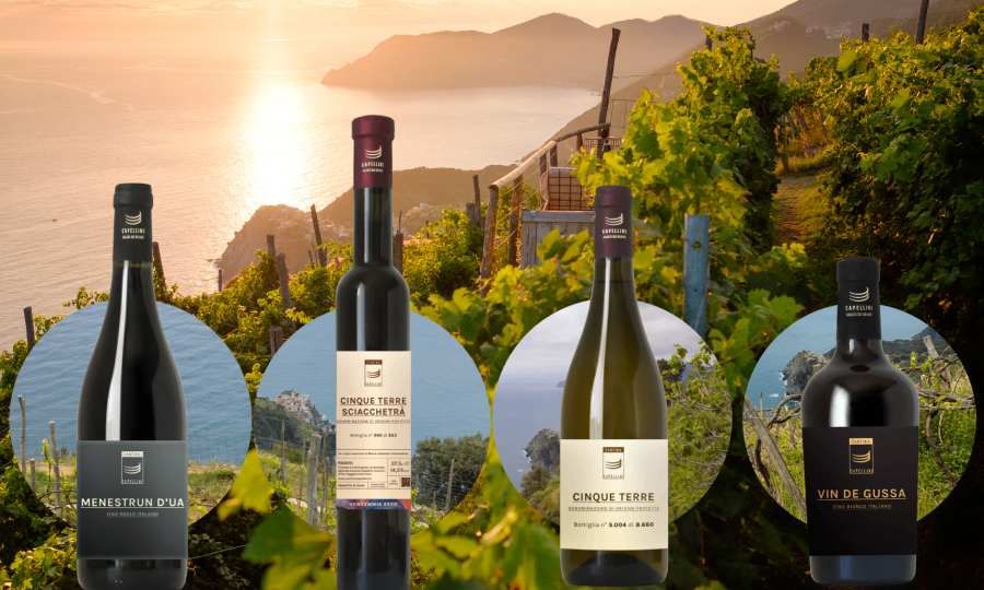 4 le etichette prodotte, capaci di dare un mixi unico di produzione ligure. Il Cinqueterre Dop, un vino che esprime le migliori qualità del terroir delle Cinque Terre, prodotto con vitigni di Bosco, Albarola e Vermentino, Menestrun d'Ua, un vino rosso dal lungo passato. Nonostante la vocazione bianchista delle Cinque terre, da tempo immemore si coltivano anche diverse varietà a bacca rossa utilizzate un tempo per il vino cd di casa. Queste, raccolte a fine vendemmia e pigiate insieme, formano il "menestrun". Sciacchetrà Dop, un vino delle ricorrenze e ognuno in paese lo custodisce gelosamente per le grandi occasioni. Lo Sciacchetrà si ricava da uve provenienti dal vitigno autoctono di Bosco con l'aggiunta di piccole quantità di Arbarola e Vermentino. È un vino di pazienza e meditazione, ideale per condividere momenti di festa e serenità. Infine Vin De Gussa, un vin di buccia. Un bianco che deriva dal recupero delle bucce dopo la pressatura dello Sciacchetrà. Le bucce vengono lasciate in una botte con la terza torchiatura del Cinque Terre Dop. Una lavorazione tipica della cultura del saper fare il vino, recuperando profumi e sapori del terroir delle nostre Cinque Terre.