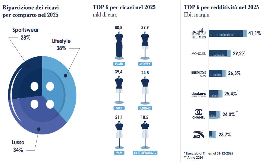 Il segmento sportswear è guidato da On Holding, che ha aumentato i ricavi di 11,3 volte rispetto al 2019 grazie al marchio On. Segue Crocs (+3,3x) e Birkenstock (+2,9x). Nel 2025 l'EBIT margin medio è 14,1%, con il lusso al 19,7%, lo sportswear al 10,0% e il lifestyle al 12,2%. I leader di redditività sono Hermès (EBIT 41,1%) e Moncler (29,2%), seguiti da Birkenstock (26,3%), Deckers Outdoor (25,4%), Chanel (24,0%), ANTA Sports (23,7%) e Prada (22,7%).