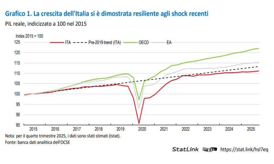 L'ultimo outlook dell'OCSE indica che l'economia italiana continuerà a crescere a ritmi contenuti ma sostenuti, nonostante gli shock recenti. La crescita del PIL è stimata allo 0,5% nel 2025, rallenterà allo 0,4% nel 2026 a causa dei rincari energetici legati al conflitto in Medio Oriente, per poi risalire allo 0,6% nel 2027.