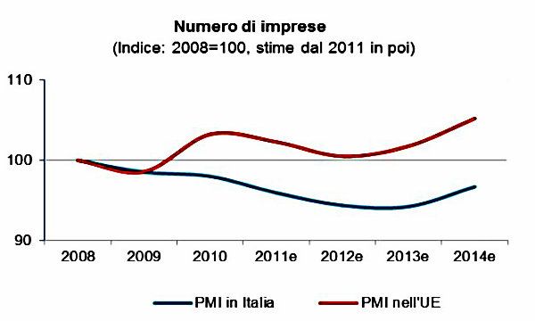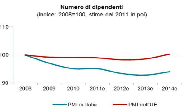 Le PMI italiane erano state colpite duramente dalla recessione mondiale del 2008-09. In seguito, le PMI hanno attraversato un breve periodo di ripresa, che tuttavia ha subito un rallentamento nel 2012. Le microimprese, che costituiscono la grande maggioranza delle aziende italiane, hanno avuto più difficoltà ad adattarsi rispetto a quelle di piccole e medie dimensioni. Il valore aggiunto delle PMI si è contratto del 10% tra il 2008 e il 2012, il numero dei dipendenti è sceso del 5% e il numero delle imprese del 2%. Nelle imprese di grandi dimensioni il valore aggiunto è tornato ai livelli precedenti alla crisi e si è registrato solo un leggero calo del numero dei dipendenti. Di conseguenza, queste imprese hanno fornito una migliore prestazione rispetto alle PMI, che sono state colpite più duramente dalla crisi economica e finanziaria. Ciò risulta particolarmente evidente nel settore edile, in cui il valore aggiunto e l\'occupazione hanno subito una riduzione rispettivamente del 30% e del 15% tra il 2008 e il 2012. Le difficoltà di accesso al credito legate alla crisi per le imprese in questo settore si sono aggravate a causa della conclusione della fase di crescita del settore stesso.
