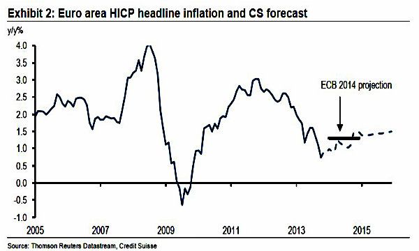 Un tasso di deposito negativo, tuttavia, è stato legato ad un contesto più deflazionistico. Questo non è lo scenario di riferimento della BCE. Anche se la Draghi ammette che l\'inflazione resterà molto bassa per un lungo periodo, il rischio per le prospettive di inflazione è stato mantenuto sostanzialmente bilanciato.“Un ulteriore calo dell\'inflazione non è la nostra previsione”, afferma Credit Suisse in una nota. “Ci aspettiamo che lo 0,7% a/a di ottobre della zona euro, possa esser stato il dato più basso. Al momento prevediamo un aumento allo 0,9% a/a a novembre, con effetti base dell’energia che aggiungano di più di 0,1 punti percentuali al tasso. Ed è anche probabile che l\'aumento ottobre dell’IVA italiana, che non sembra aver avuto un impatto nel mese scorso, venga passato meglio nel mese di novembre. Tuttavia, come indicano le nostre previsioni, la BCE rischia di rivedere la sua proiezione sull\'inflazione pubblicata a settembre, evidenziando un calo a dicembre”.