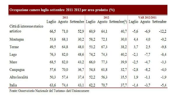 Nel mese di luglio le quote più alte di venduto si registrano nelle strutture del Nord Est (66,6% di occupazione camere) e del centro (60,8%) mentre in agosto, dopo il Nord Est (74,6%), emergono le mete del Sud e delle isole (69,9%). Ma specialmente in agosto sono proprio le imprese ricettive del Mezzogiorno (-6,4%) e del centro Italia (-4,6%) a registrare trend discendenti rispetto al 2011.Certo le temperature torride non hanno favorito alcuni prodotti, come le città di interesse storico artistico, che segnano un dato medio di occupazione pari al 60,9% in luglio (-5,6%) e al 64,1% in agosto (-6,9%), ma nel mese di agosto sono le località di campagna (-8,2%) e dei laghi (-7,7%) a registrare i cali più evidenti, mentre al mare, dove le imprese registrano in media il 66% di occupazione a luglio (-2,5%) ed il 77,3% ad agosto (-4,7%), il calo è più contenuto.