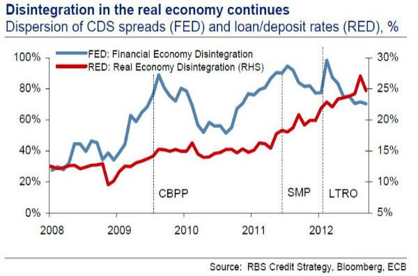 Il problema principale è che l\'unione monetaria non è accompagnata da un sistema bancario e da una unione fiscale - e, quindi, un euro in Spagna vale meno di uno in Germania. Per questo motivo continua la fuga di capitali, spostando fondi dalla periferia e costringendo le banche periferiche ad alzare i tassi di deposito di trattenerli. Il rovescio della medaglia è rappresentato più elevati tassi di prestito, che colpiscono le imprese nazionali e aumentando i fallimenti, e in ultima analisi gravando sul capitale delle banche, e alla fine sui bilanci sovrani.Nel 2013, i politici europei hanno la possibilità di muoversi verso una soluzione. L’Europa ha bisogno di un’unione bancaria con un meccanismo di risoluzione comune, un\'autorità di vigilanza e di un fondo di garanzia dei depositi, come fortemente sostenuto dall’FMI. Questo offrirà la possibilità di fermare la divergenza finanziaria centro-periferia e di stabilizzare il sistema bancario europeo. La Commissione Europea prevede che la BCE si assuma l’autorità di vigilanza sulle grandi banche nel mese di luglio 2013 e per tutte le banche entro l\'inizio del 2014, ma il consenso sul fondo di garanzia dei depositi è ancora mancante. Questo è un punto cruciale, ma su cui continueranno ad esserci molte resistenze dai principali Paesi europei, quelli che beneficiano della fuga di capitali. Il risultato più probabile sarà quindi una parziale soluzione: un supervisore comune e meccanismo di risoluzione, ma nessun fondo di garanzia.